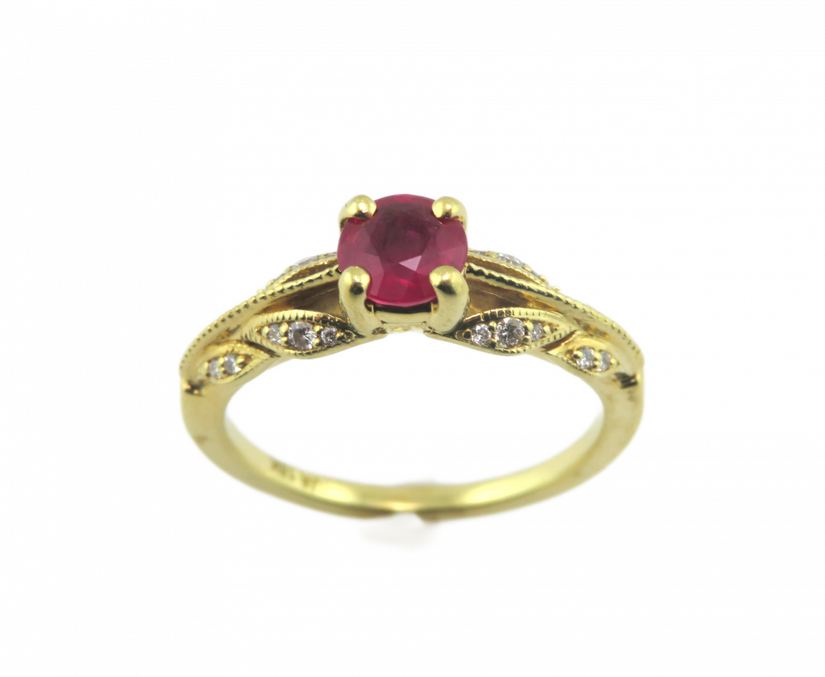 18 KT Engagement ring with a Ruby Center and side diamonds by James Allen