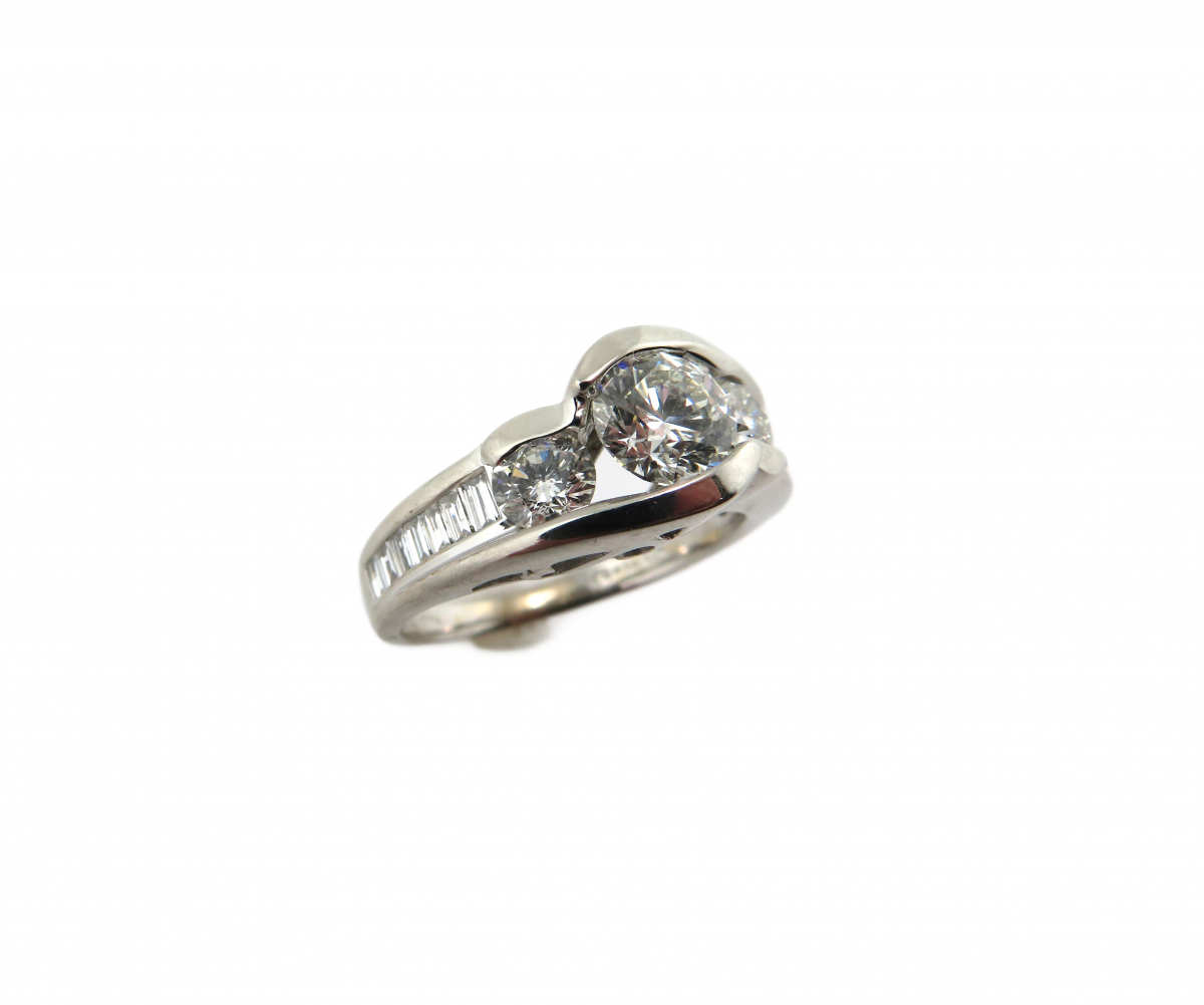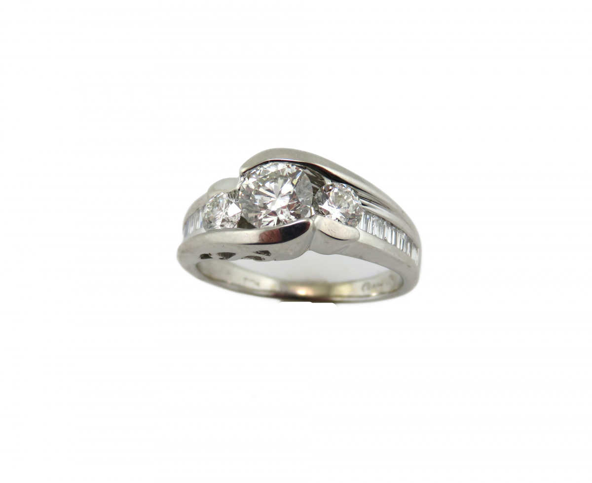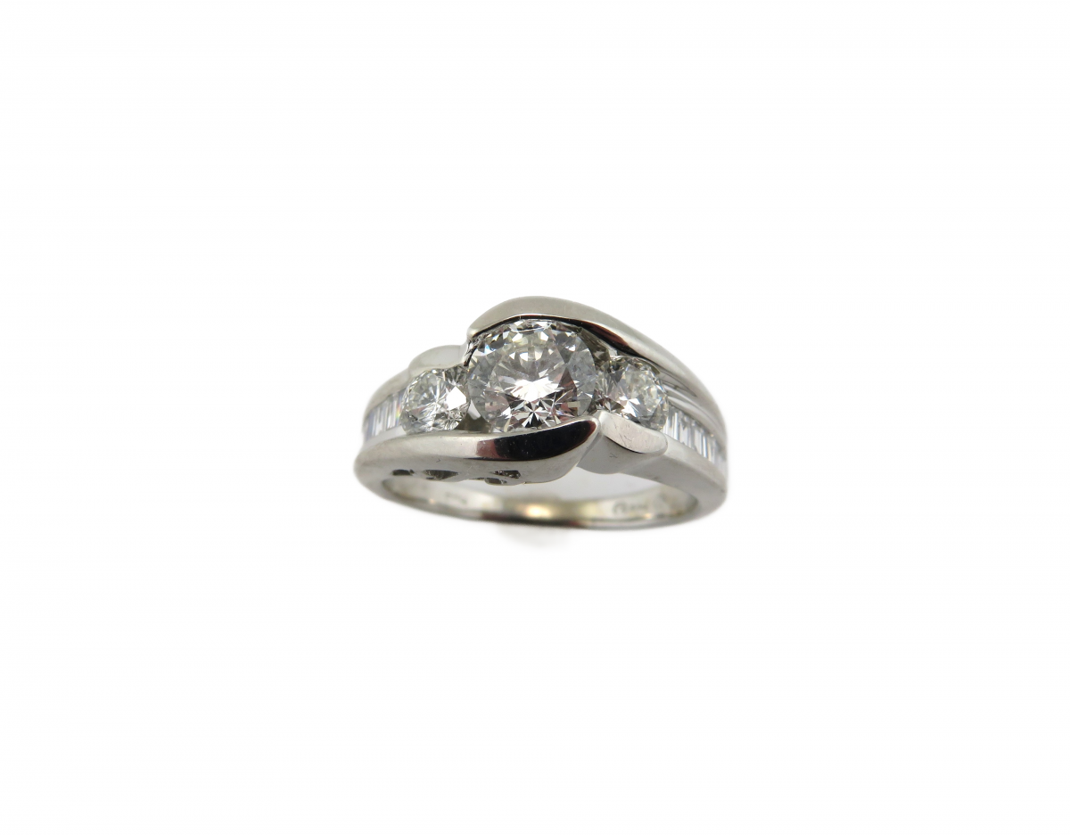 • Share "3 round diamond center stones with baguette diamonds down the sides in white gold" on Google Plus