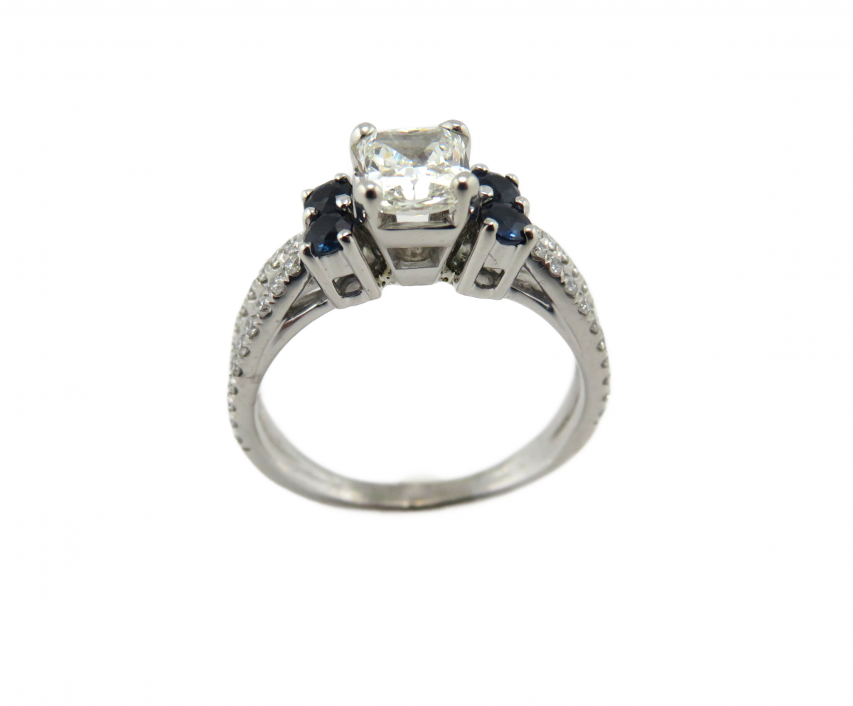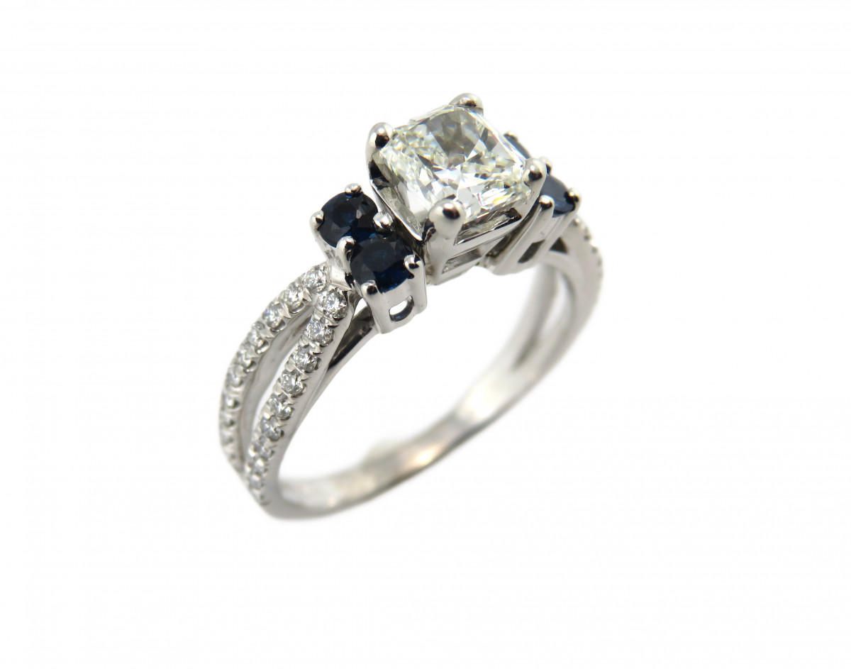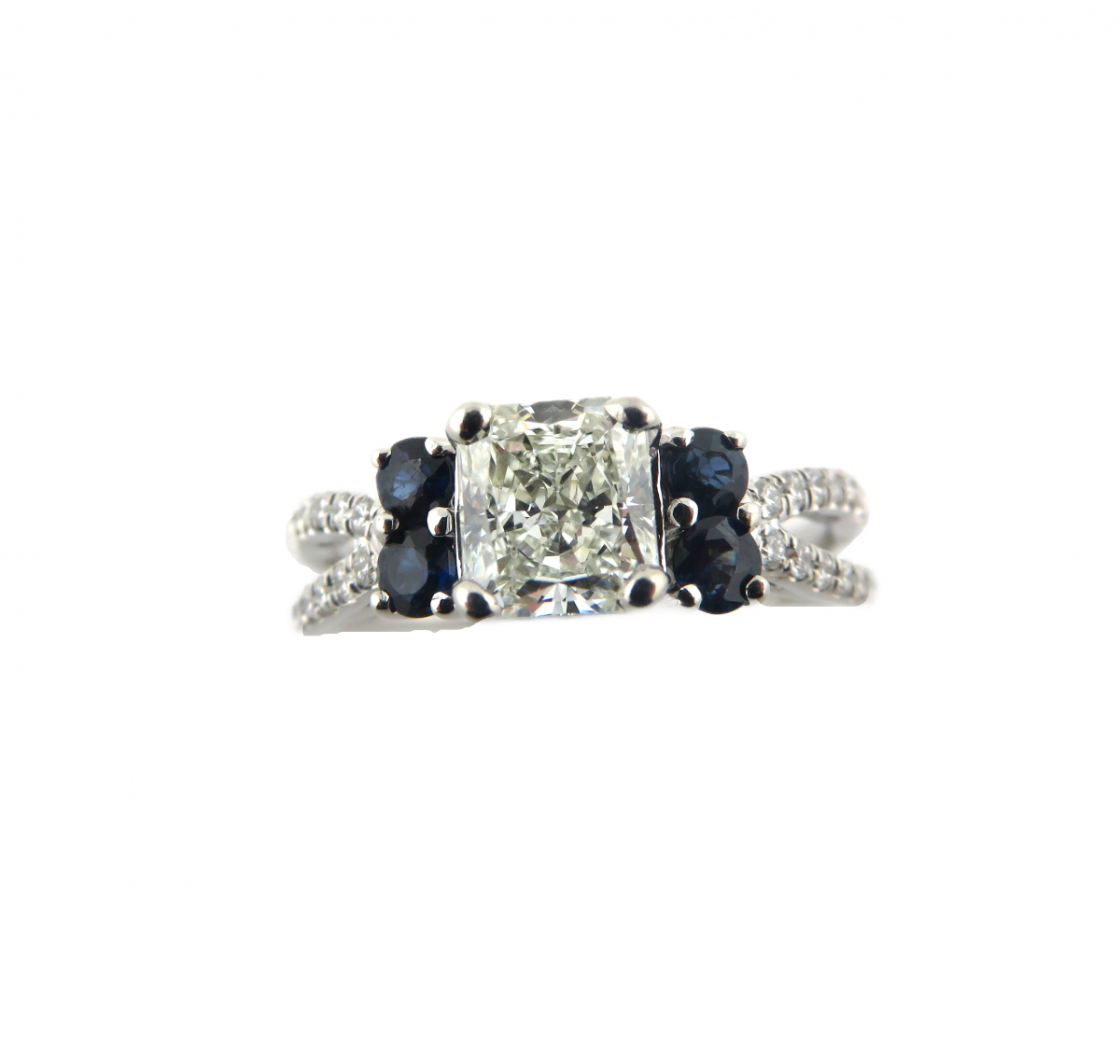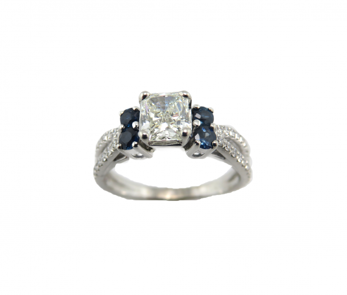 • Share ".92 Radiant cut Diamond with 40 side Diamonds and 4 Sapphires in White Gold" on LinkedIn