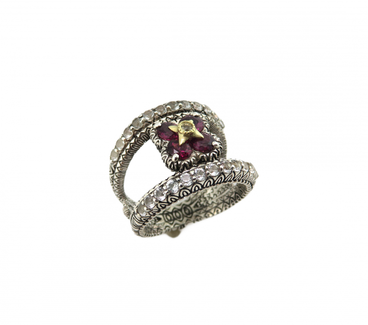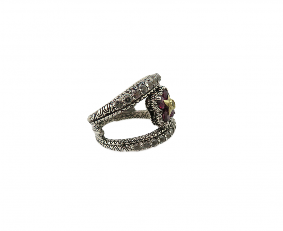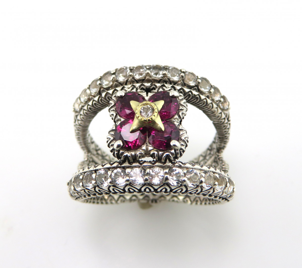 • Share "Barbra Bixby White Topaz and Rhodilite Garnet Silver ring with 18kt accents" on Facebook