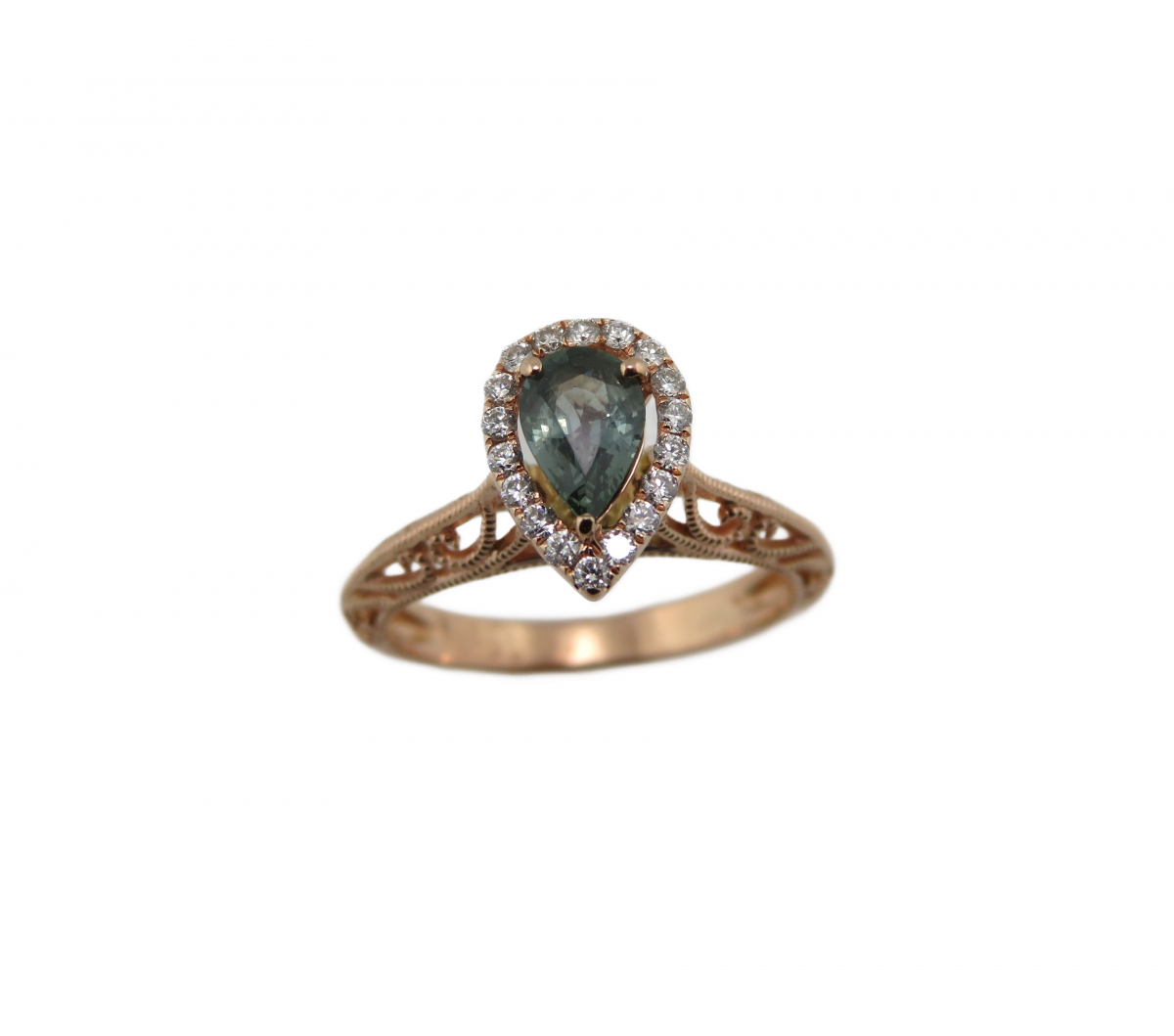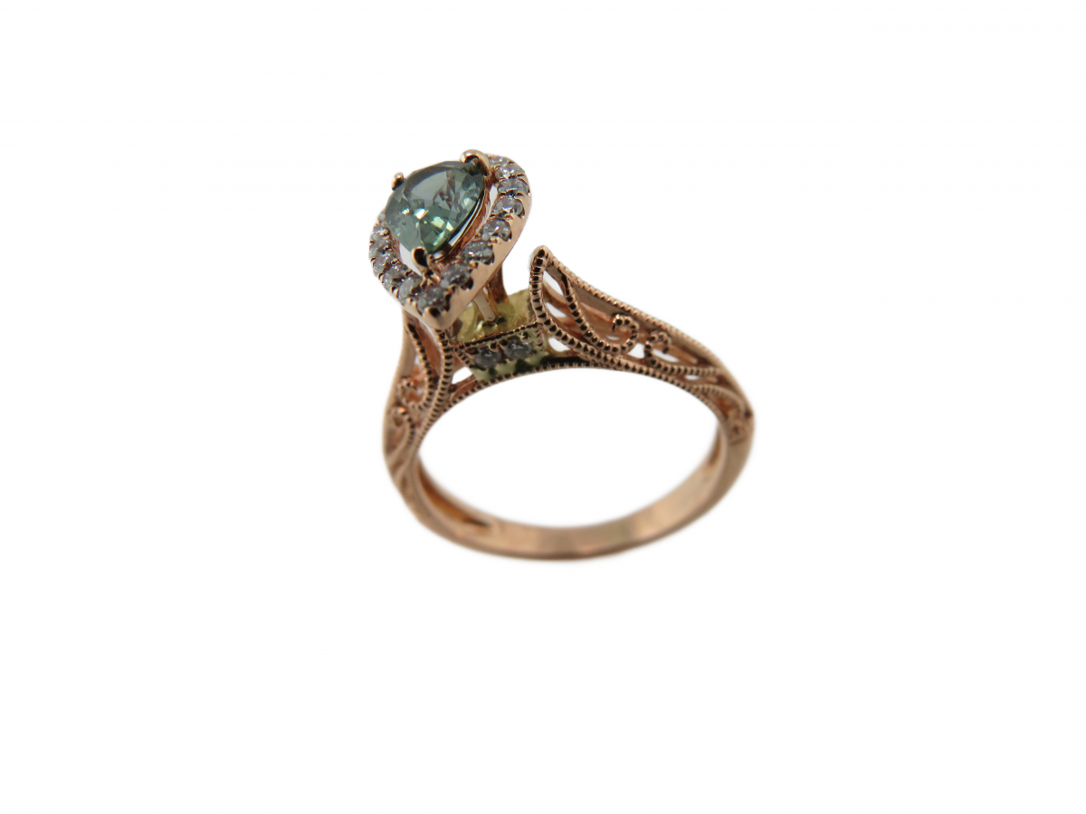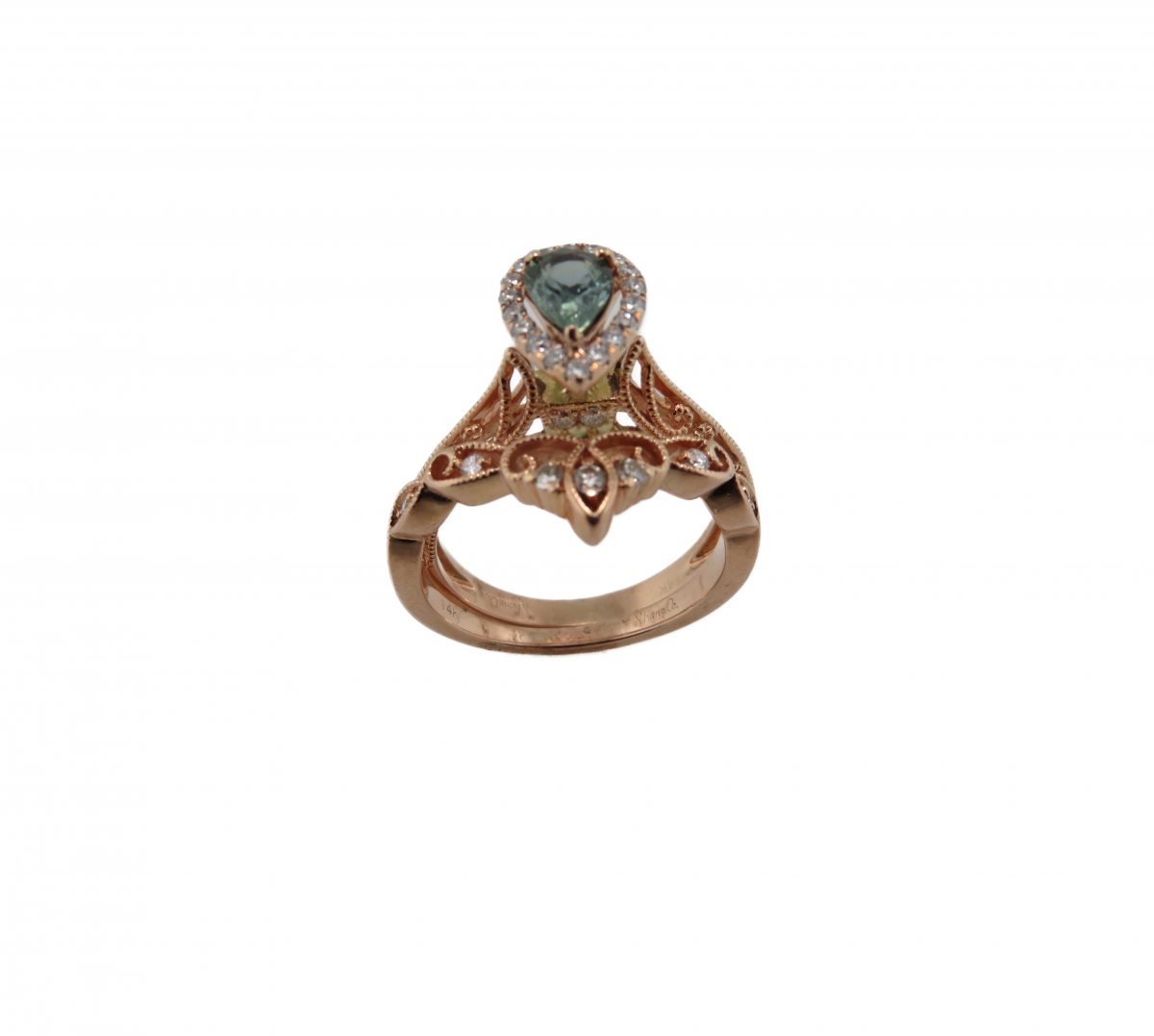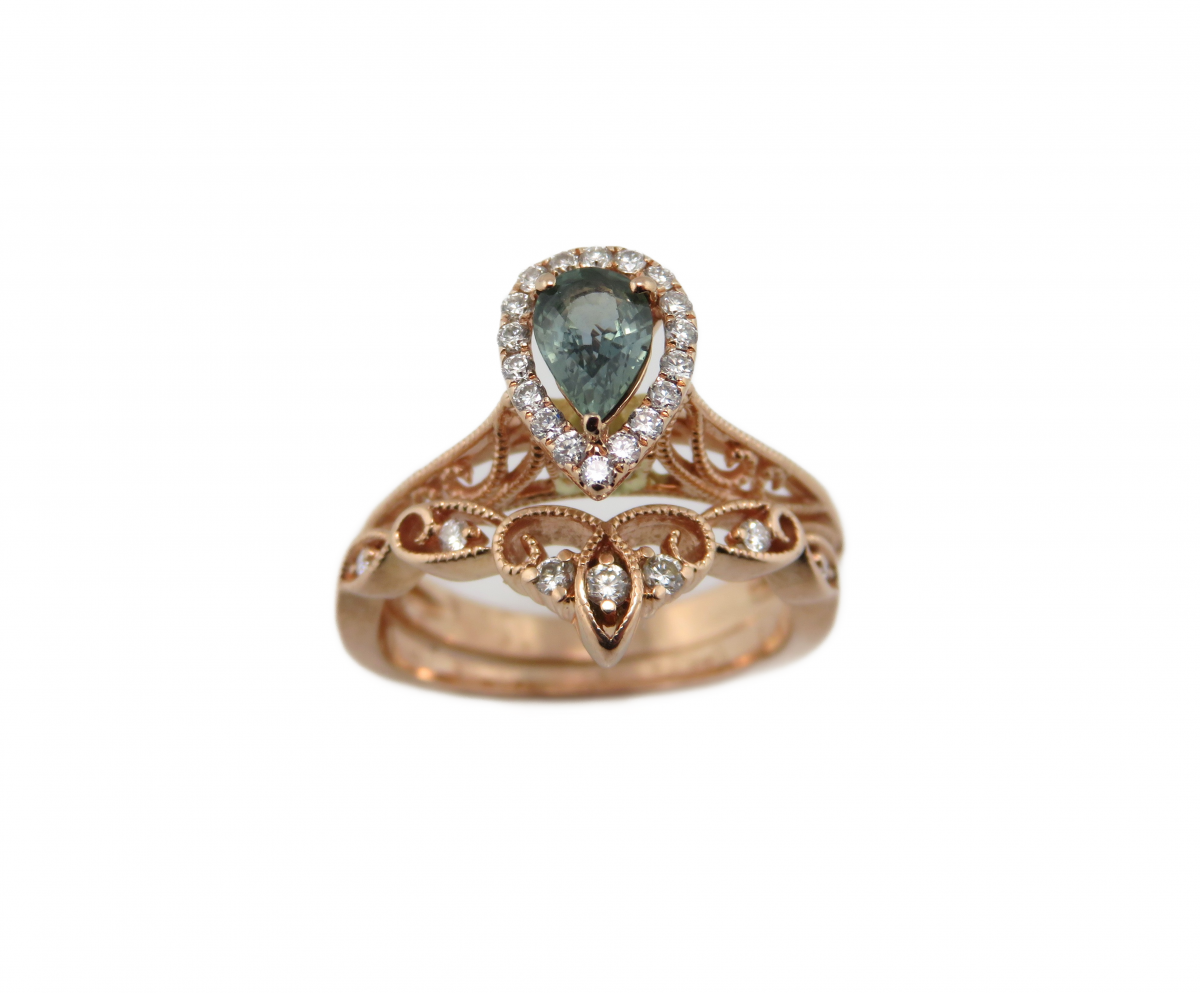 - Pin "Rose gold Bridal set with pear green/Blue diamond halo center and filigree mounting" on Pinterest