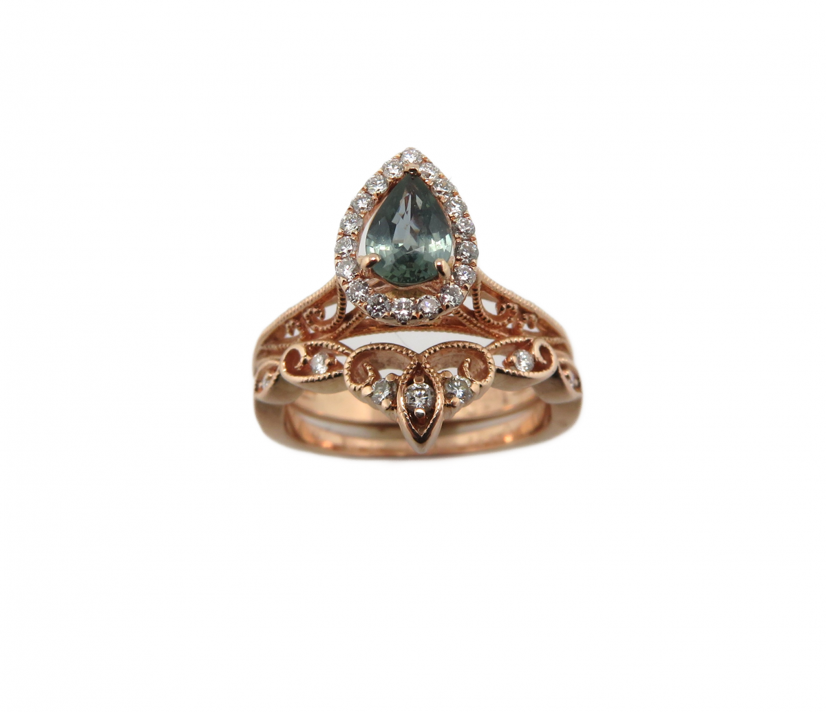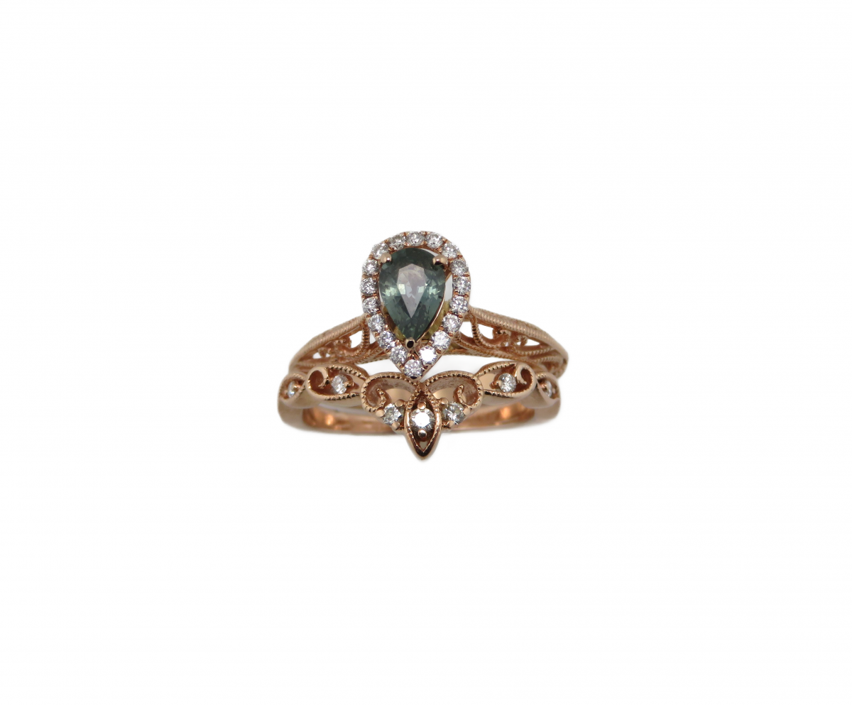 Rose gold Bridal set with pear green/Blue diamond halo center and filigree mounting