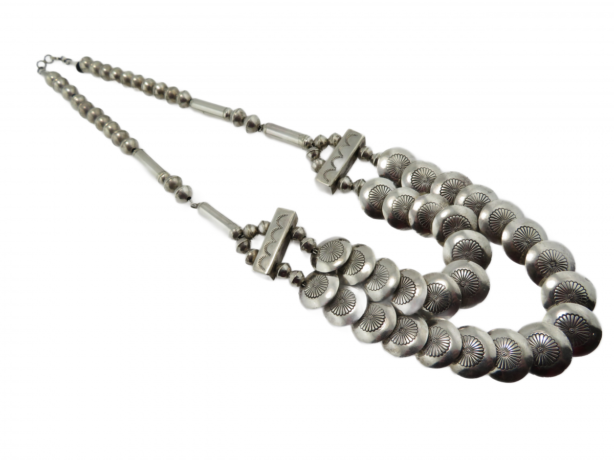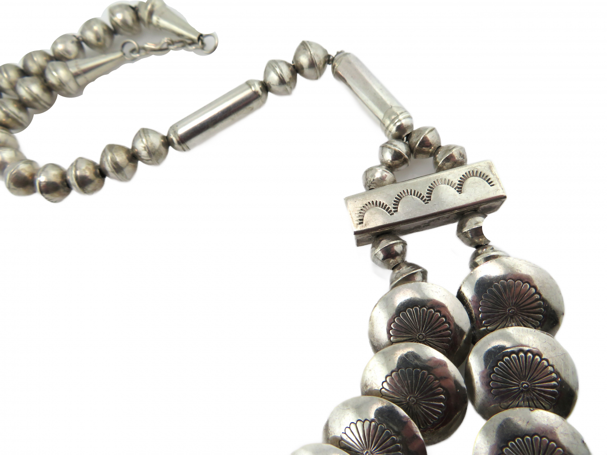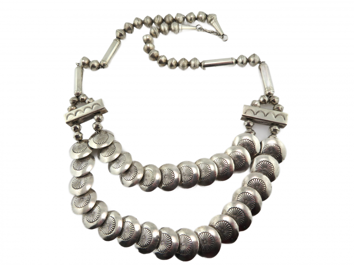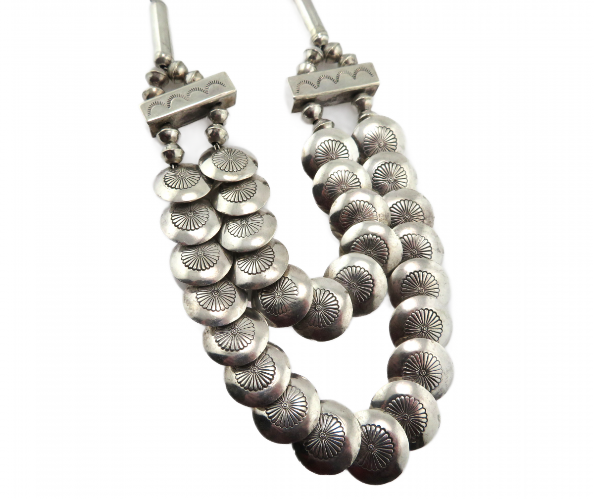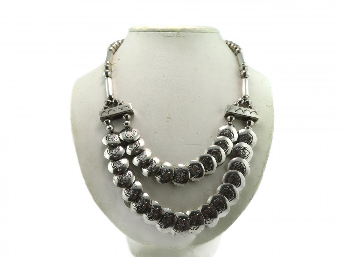 Home  Necklaces  Sterling Double row stamped “Pillow” beads Native American necklace