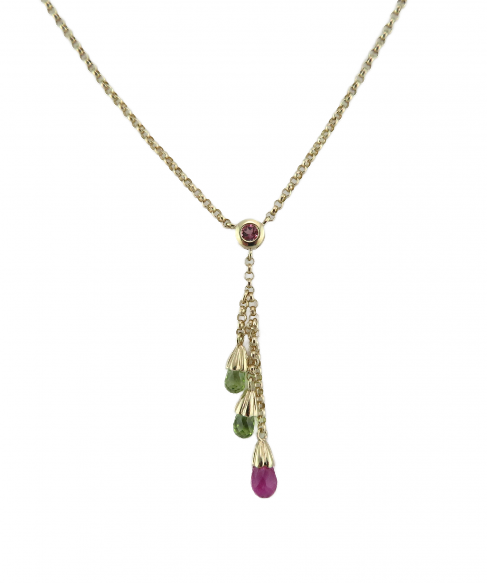 Briolette Green and Pink Lavaliere Necklace in Yellow gold