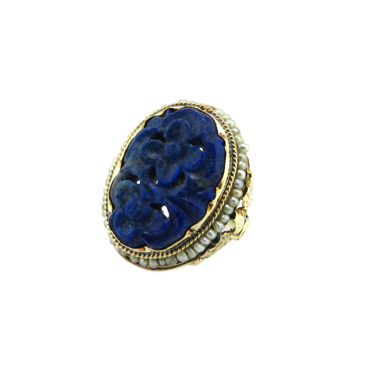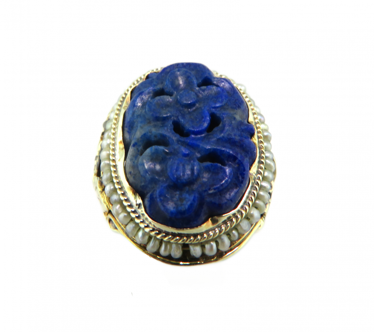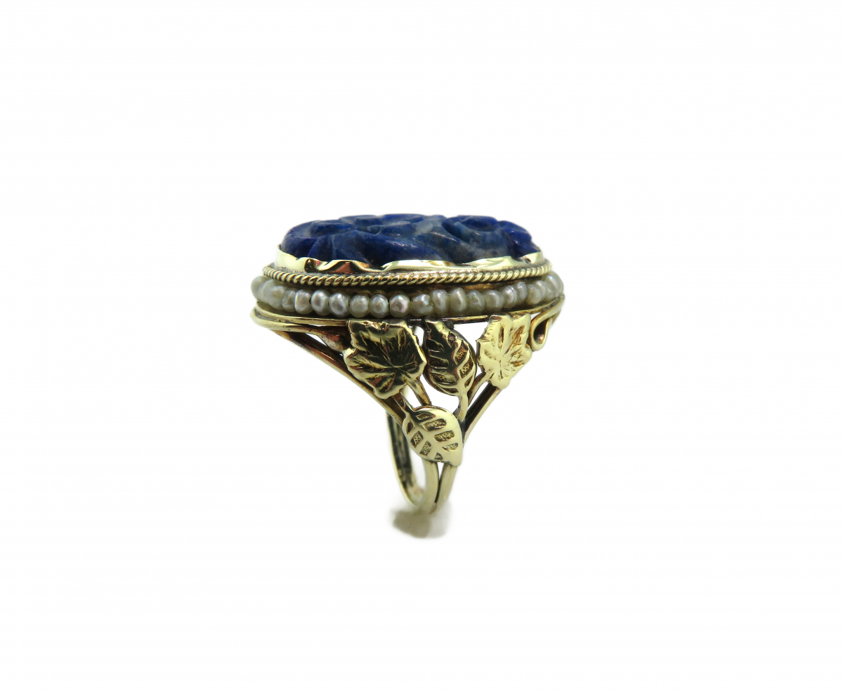 Home  Rings  Fashion  Ladies  Gemstone  Vintage Carved Lapis and seed pearl ring